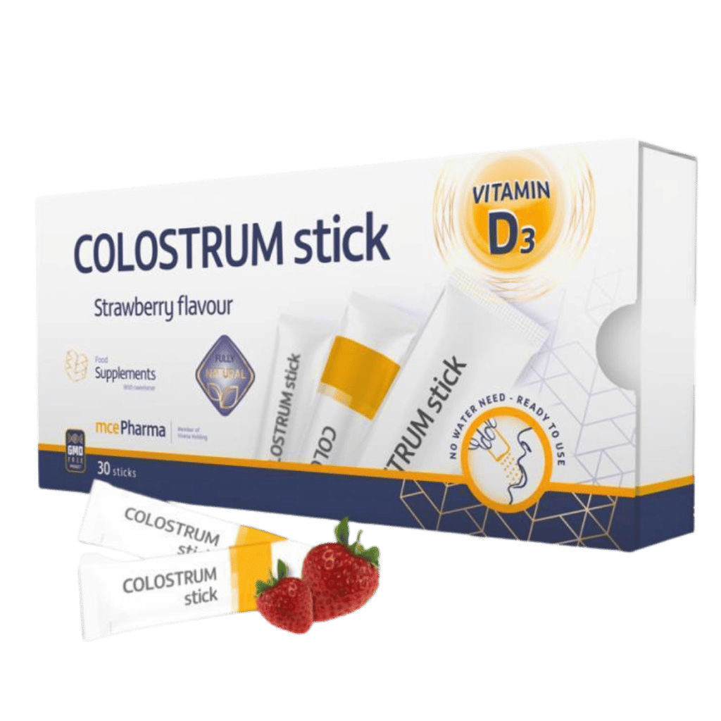 Unique orally soluble Colostrum and Vitamin D, innovated form of food supplement to support healthy immune system. Unique user friendly dosage form, great strawberry flavour, Innovative form – practical packaging in individual sachets 800 mg of Colostrum in one sachet/stick, 100% natural product.
